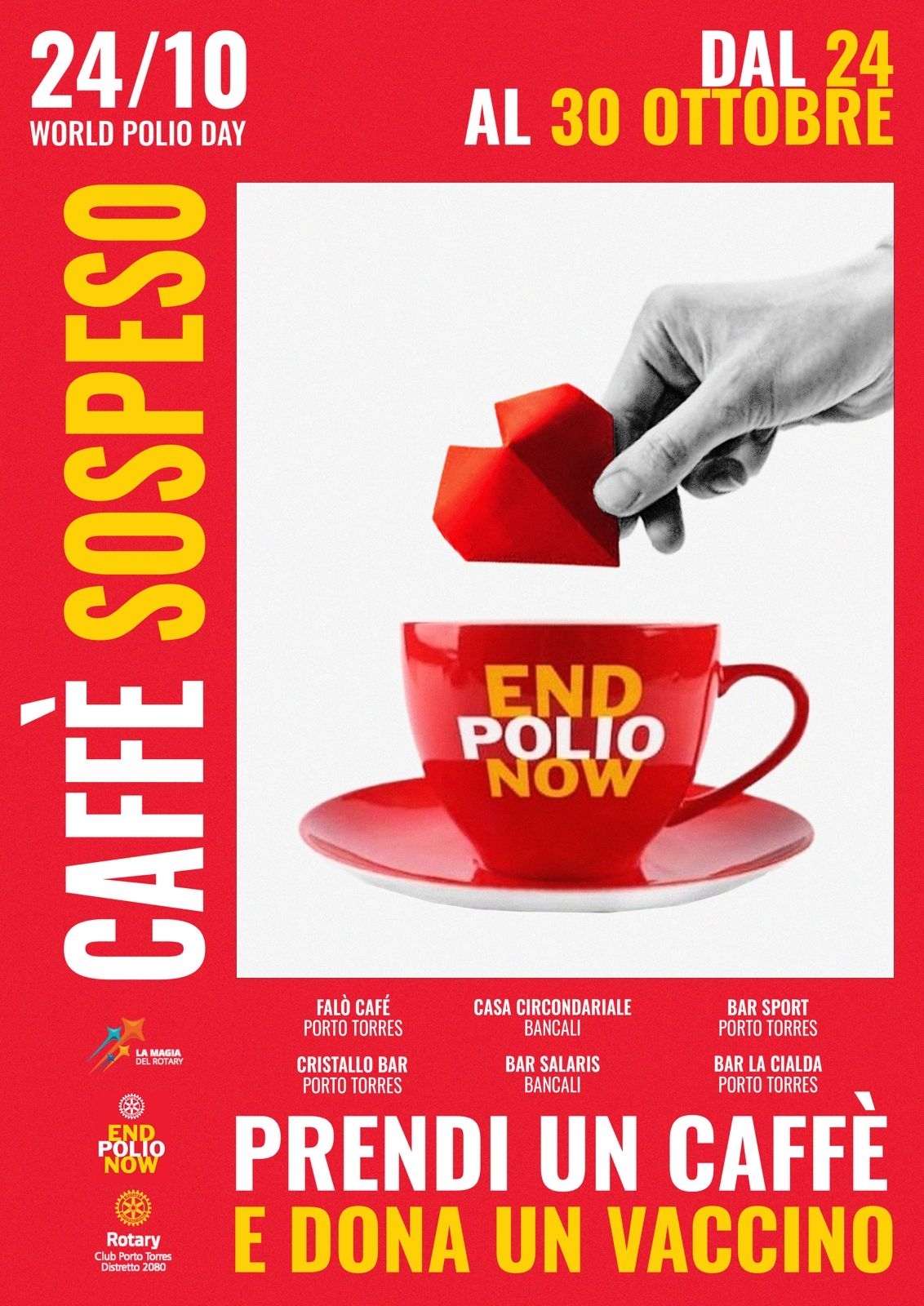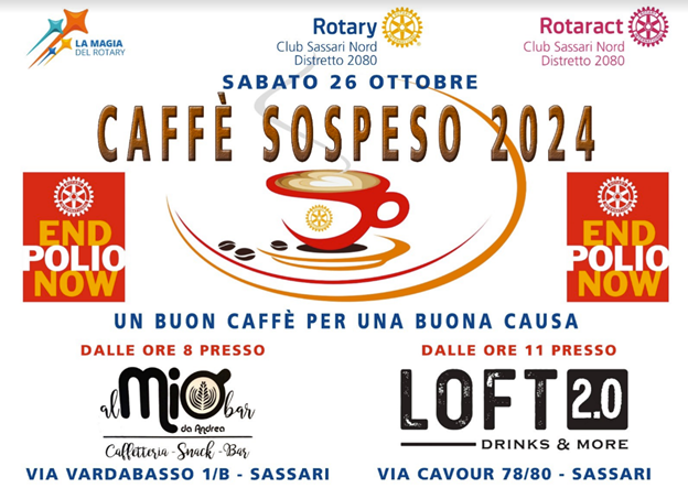 To celebrate World Polio Day, numerous initiatives will be promoted on a national and local level to mark this important anniversary, starting next Monday 21 October and in the days to follow. In particular, among the events carried out by the various Rotary and Rotaract Clubs, we would like to mention some initiatives such as ‘the suspended coffee to fight polio’.
